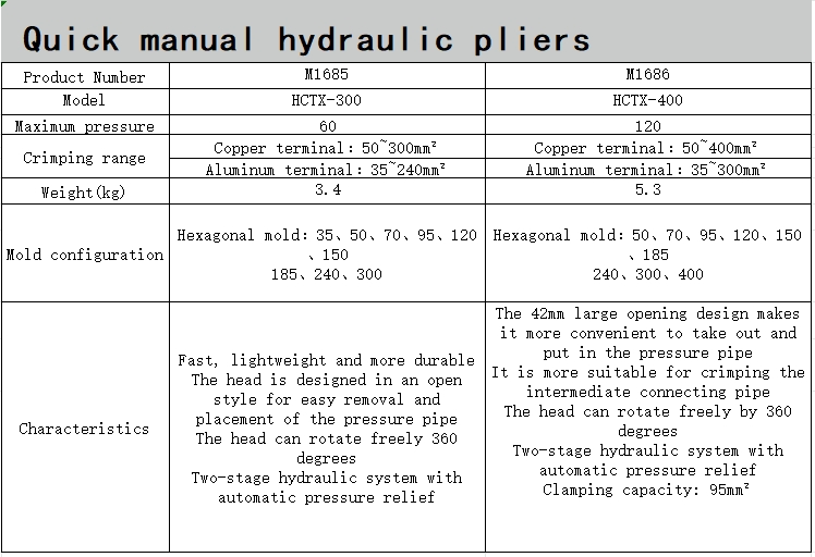 الكماشة الهيدروليكية اليدوية السريعة هي أداة هيدروليكية محمولة، تستخدم بشكل أساسي في عمليات تجعيد وقص الأسلاك والكابلات وتجهيزات الأنابيب وما إلى ذلك في مجالات الطاقة والاتصالات والنقل وغيرها من الصناعات. تشتمل مكوناتها الأساسية على المضخات الهيدروليكية اليدوية، والأسطوانات الهيدروليكية، وقوالب التجعيد والوصلات السريعة، وما إلى ذلك، والتي يمكن أن توفر عمليات تجعيد وقص فعالة ودقيقة.