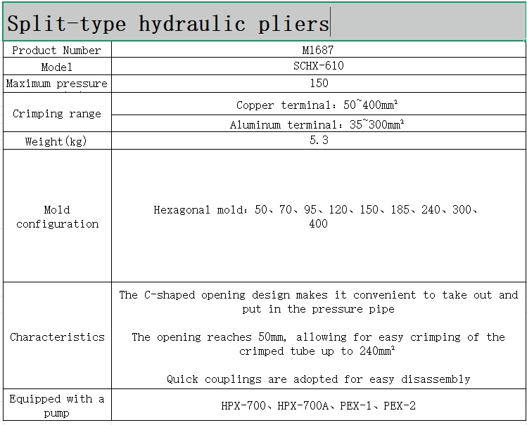 المشبك الهيدروليكي من النوع المنفصل عبارة عن أداة هيدروليكية مصممة بوحدة الطاقة الهيدروليكية ورأس المشبك منفصل. يتم استخدامه بشكل رئيسي في عمليات تجعيد وقص الأسلاك والكابلات وتجهيزات الأنابيب وما إلى ذلك في صناعات الطاقة والاتصالات والنقل وغيرها. تشتمل مكوناتها الأساسية على المضخات الهيدروليكية، والخراطيم الهيدروليكية، ورؤوس المشبك وأنظمة التحكم، وما إلى ذلك، والتي يمكن أن توفر عمليات تجعيد وقص فعالة ودقيقة.